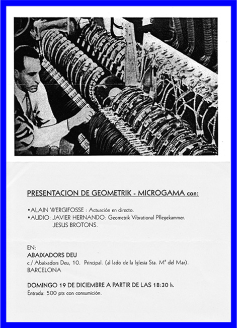 Ante mi poca predisposición a ofrecer conciertos en directo los últimos años varias veces se me ha ofrecido la posibilidad de hacer alguna sesión como d.j. algo que finalmente apenas he ejercido salvo las presentaciones de Geometrik-Microgama. Sin embargo mi primera actividad musical fue como disk-jockey en la legendaria tienda de Gay&Co en la calle Hospital durante los años 1978 y 1979, aparte de ambientar las salas con el desbordante material innovador de esa época y encargarme de peticiones de audición podía a veces jugar con los platos, recuerdo especialmente las mezclas que hacía de diferentes grabaciones de disco o funk con pasajes de fondo de la serie EGG que acaba de publicarse en España y especialmente el Con de Conrad Schnitzler. Este tipo de debilidades descolocaba un poco la ortodoxia punk de mi entorno pero también me llevó a contactar con visitantes de la tienda como Patricia Godés o Nacho Canut.