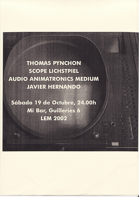 Lo que sí al final realizé como d.j. fue un viejo proyecto de Los Silencios de la Radio de recreaciones de sonido basados en textos literarios en que la música estuviera de alguna manera presente; a este proyecto lo lo llamé Audio Animatronics Médium y la primera sesión fue dedicada a Thomas Pynchon dentro del Festival Lem del 2002, siguen pendientes otras dedicadas a Raymond Roussell ya anticipada en un programa de Los Silencios de la Radio, J.G. Ballard e Yves Adrien . También ambienté las presentaciones de Geometrik/Micrograma , en la Sala Radar de Madrid y en Abaixadors en Barcelona con una sesión que titulé Geometrik Vibrational Pflegekammer que cubría toda la historia de ediciones de Discos Esplendor Geométrico.